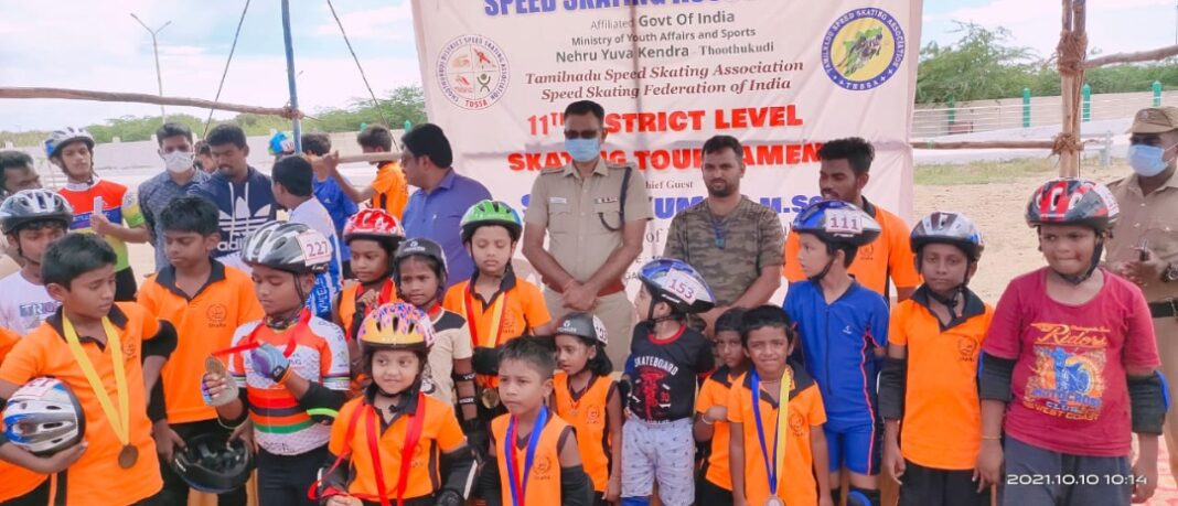 இந்திய அரசு இளைஞர் நலம் மற்றும் விளையாட்டு அமைச்சகத்தின் நேரு யுவகேந்திராவில் இணைவு பெற்ற தூத்துக்குடி மாவட்ட ஸ்பீடு ஸ்கேட்டிங் சங்கம், ஸ்கேட்டிங் விளையாட்டு வீரர்களுக்கு பயிற்சி அளித்து வருகிறது. இந்த விளையாட்டு சங்கம் சார்பாக இன்று (10.10.2021) தூத்துக்குடி முத்துநகர் கடற்கரை ஸ்கேட்டிங் மைதானத்தில் 11வது மாவட்ட அளவிலான ஸ்கேட்டிங் போட்டி நடைபெற்றது. இந்த ஸ்கேட்டிங் போட்டியில் 3 வயதிலிருந்து 16 வயதுக்குட்பட்ட பிரிவு மற்றும் 16 வயதிலிருந்து 20 வயதுக்குட்பட்ட பிரிவு என இரு பிரிவுகளிலும் மொத்தம் 65 மாணவ மாணவிகள் மாவட்டம் முழுவதிலும் இருந்து கலந்து கொண்டனர். இதில் வெற்றி பெற்ற மாணவ மாணவியர்களுக்கு இன்று பரிசு வழங்கும் விழாவில் மாவட்ட காவல் கண்காணிப்பாளர் திரு. எஸ். ஜெயக்குமார் அவர்கள் சிறப்பு விருந்தினராக கலந்து கொண்டு சான்றிதழ் மற்றும் பதக்கங்கள் வழங்கி பாராட்டினார்.