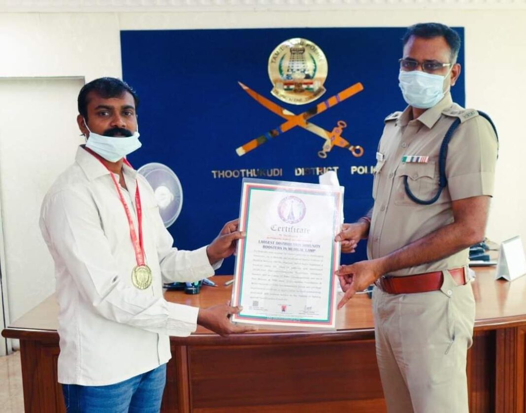 தூத்துக்குடி மாவட்ட காவல் கட்டுப்பாட்டு அறையை சேர்ந்த முதல் நிலை காவலர் ராஜலிங்கம் என்பவர் கொரோனா பெருந்தொற்று காலத்தில் பொதுமக்களுக்கு நோய் எதிர்ப்பு சக்திகளை அதிகரிக்கும் மருந்துகளை மதுரை மது இன்ஸ்டிடியூட் ஆப் மெடிக்கல் சயின்ஸ் நிறுவனத்தின் உதவியுடன் பெற்று பல்வேறு மருத்துவ முகாம்கள் மூலம் அதிக அளவில் இலவசமாக வழங்கி சேவை செய்துள்ளார். இச்சேவையை பாராட்டி ‘வேர்ல்டு ரெக்கார்டுஸ் இந்தியா” (World Records India) சார்பில் கடந்த 03.09.2021 அன்று சான்றிதழ் மற்றும் பதக்கம் வழங்கியுள்ளது.