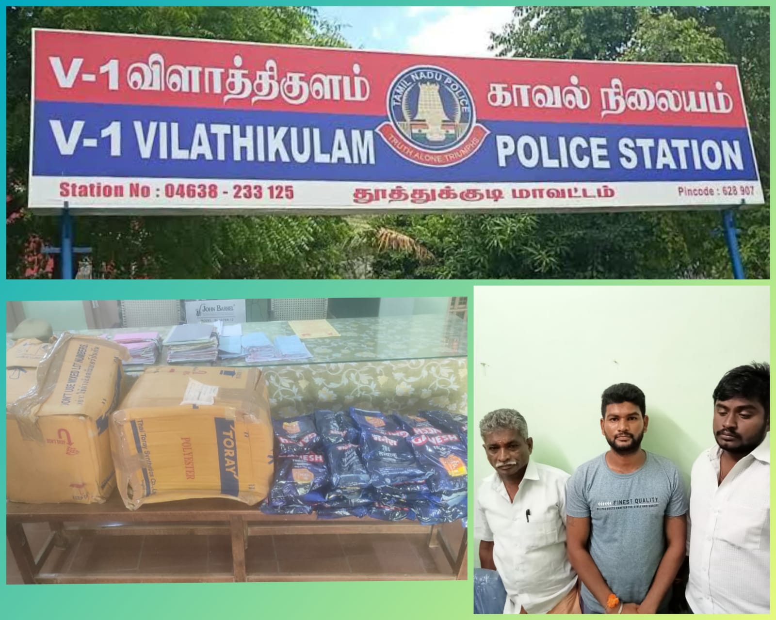 ♻️ போலீசாருக்கு கிடைத்த இரகசிய தகவலின் படி விளாத்திகுளம் மீரான் பாளையத்தை சேர்ந்த குருசாமி மகன் முருகவேல் (55) என்பவர் மளிகை கடை நடத்தி வந்த நிலையில் அவருக்கு சொந்தமான கடையில் சோதனை செய்தபோது தமிழக அரசால் தடை செய்யப்பட்ட புகையிலை பொருட்கள் பதுக்கி வைத்து 18 வயதிற்கு உட்பட்ட சிறுவர்களுக்கு விற்பனை செய்தது தெரியவந்தது, உடனே போலீசார் 4 சாக்கு பைகளில் ரூபாய் 28,000/- மதிக்கத்தக்க புகையிலைப் பொருட்களை பறிமுதல் செய்து, அதனை குழந்தைகளுக்கு விற்பனை செய்த அதே ஊரைச் சேர்ந்த முருகவேல் மகன் ராதாகிருஷ்ணன் (26), மற்றும் முனியசாமி மகன் மாரி கண்ணன் (27) ஆகிய மூன்று எதிரியையும் கைது செய்து சிறையில் அடைத்தனர்.