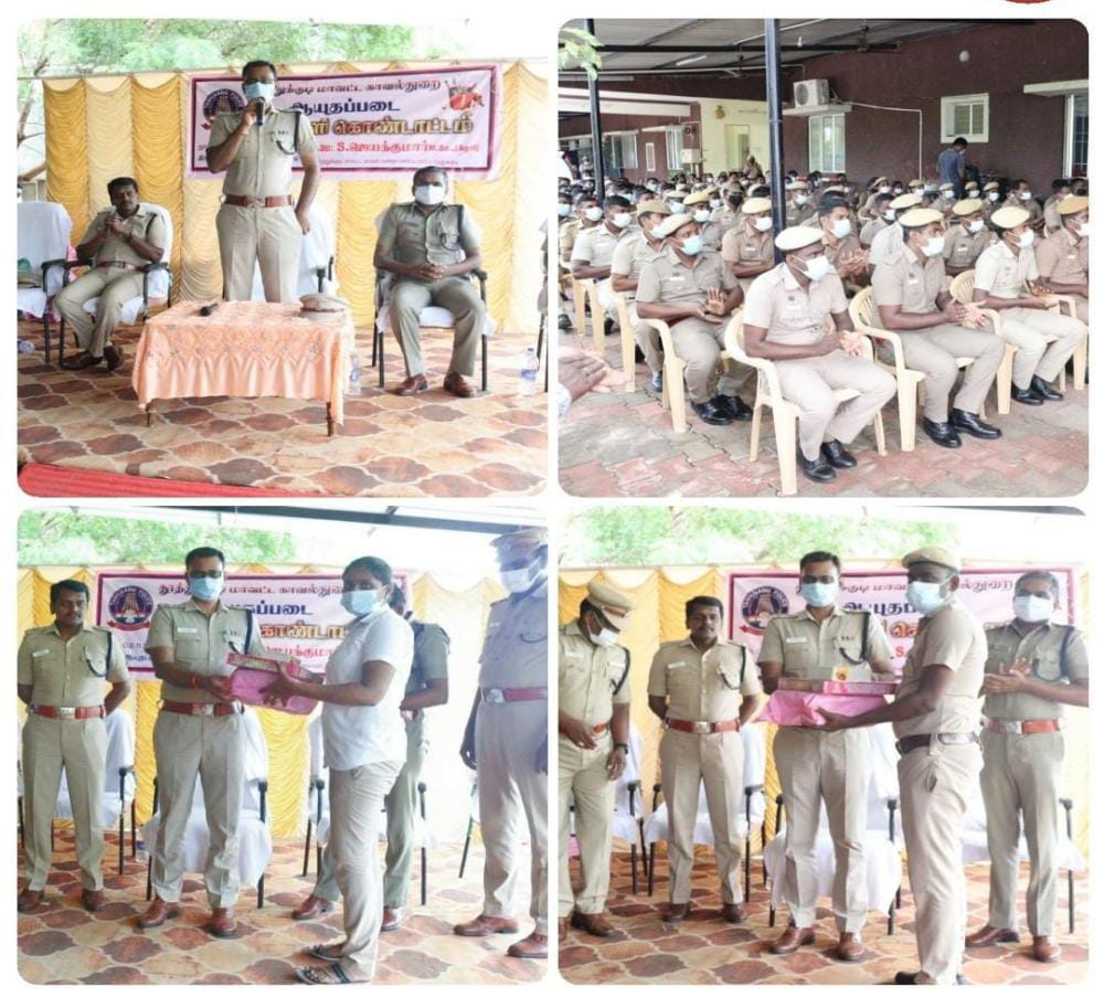 தீபாவளி பண்டிகையை முன்னிட்டு தூத்துக்குடி மில்லர்புரத்தில் உள்ள தூத்துக்குடி மாவட்ட ஆயுதப்படை வளாகத்தில் ஆயுதப்படை காவலர்களுக்கு மாவட்ட காவல் கண்காணிப்பாளர் திரு. எஸ். ஜெயக்குமார் அவர்கள் இன்று (02.11.2021) தீபாவளி வாழ்த்துக்கூறி காவலர்களை ஊக்கப்படுத்தி சிறப்புரையாற்றினார். மேலும் தலை தீபாவளி கொண்டாடும் காவலர்கள் 46 பேருக்கு பட்டாசு, இனிப்பு மற்றும் பரிசு வழங்கினார்.