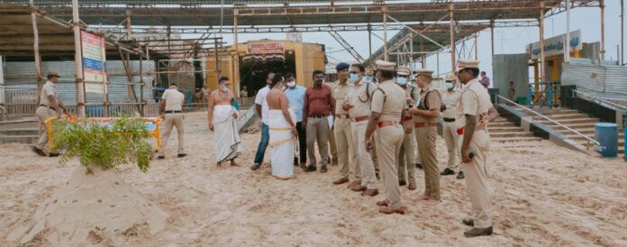 இன்று நடைபெற உள்ள திருச்செந்தூர் கந்த சஷ்டி சூரசமஹாரம் மற்றும் நாளை (10.11.2021) நடைபெறவுள்ள திருக்கல்யாணம் ஆகியவற்றிற்கு பக்தர்கள் வர அனுமதி மறுக்கப்பட்டுள்ளது. அதே போன்று சஷ்டி விரதம் இருப்பவர்கள் கோவில் வளாகத்தில் தங்குவதற்கும், விடுதிகளில் பக்தர்கள் தங்குவதற்கும் தடை விதிக்கப்பட்டுள்ள நிலையில் திருச்செந்தூர் கோவில் வளாகம், திருச்செந்தூர் சுற்றுவட்டாரப் பகுதிகளில் போலீசார் ரோந்துப் பணி மேற்கொண்டு வருகின்றனர்.