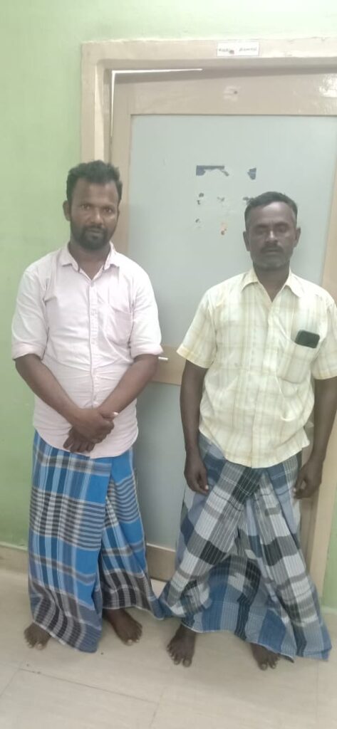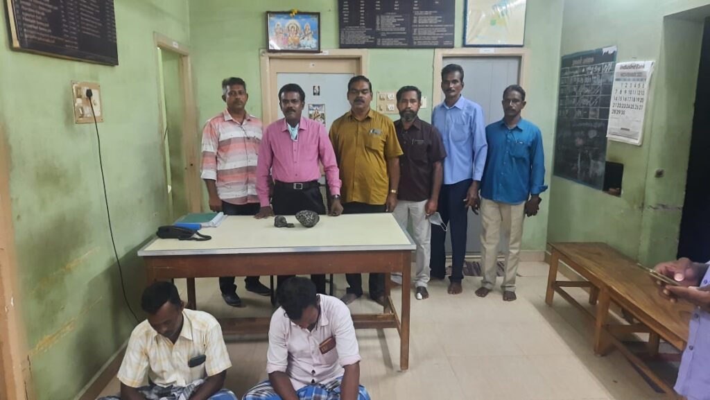 நாகப்பட்டினம் மாவட்டம் வேட்டைக்காரனிருப்பு காவல் சரகம் வெள்ளப்பள்ளம் கடற்கரையில், க்யூ பிரிவு குற்ற புலனாய்வு துறை காவல் துணை கண்காணிப்பாளர் திரு.சிவசங்கரன் அவர்களின் உத்தரவின் பேரில் காவல் ஆய்வாளர் திரு.அருண் பிரசாத் அவர்கள் தலைமையில் ரகசிய முறையில் கண்காணிப்பு செய்த போது சந்தேகபடும்படியாக இருந்தவர்களை பிடித்து விசாரணை செய்த போது 1 ) பாலகுரு வ 37 சுப்பிரமணியன் மீனவர்காலனி, வெள்ளப்பள்ளம், 2) ஆனந் ( எ ) சத்தியானந்தம் வ43 த/பெ குப்புராஜ், மீனவர்காலனி, வெள்ளப்பள்ளம், என்றும் பாலகுரு கையில் வைத்திருந்த பையை சோதனை செய்தபோது அதில் சுமார் 2.36 Kg அம்பர்கிரிஷ் வைத்திருந்தனர் இவர்களை கைது செய்து விசாரணை செய்து வருகின்றனர் இதன் மதிப்பு சுமார் ரூ.2 கோடி ஆகும்.