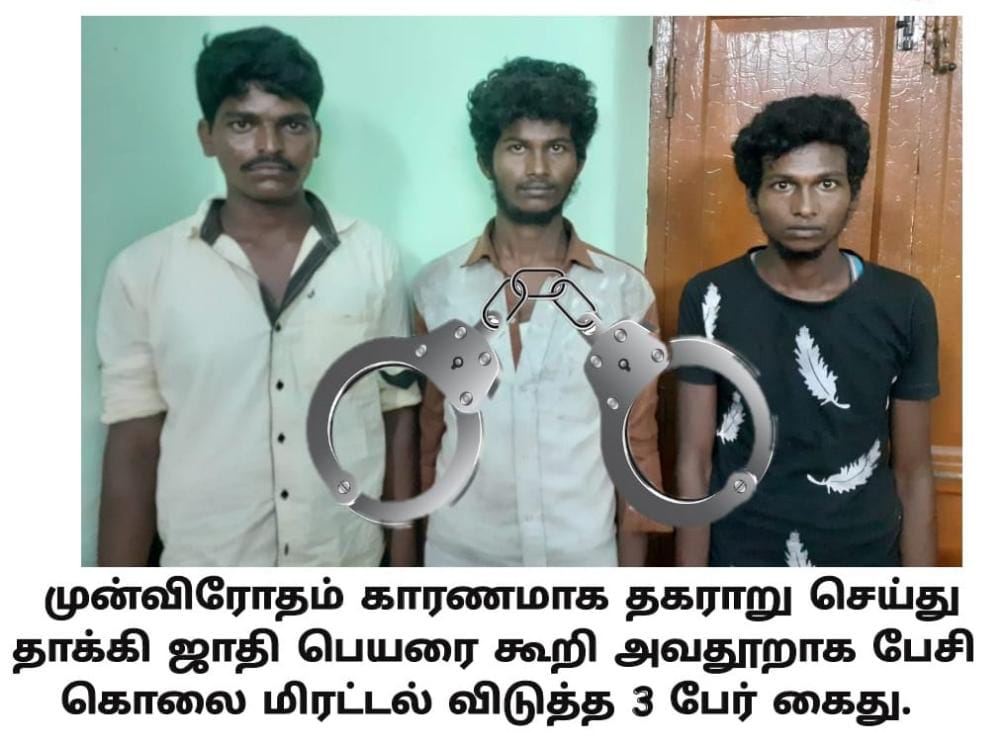 தட்டாப்பாறை காவல் நிலைய எல்லைக்குட்பட்ட பகுதியில் முன்விரோதம் காரணமாக தகராறு செய்து தாக்கி ஜாதி பெயரை கூறி அவதூறாக பேசி கொலை மிரட்டல் விடுத்த 3 பேர் கைது.