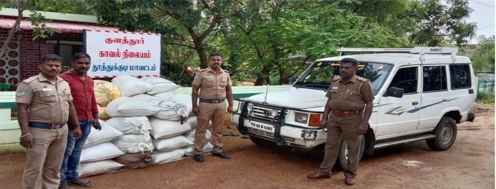 அதன்படி விளாத்திகுளம் காவல் துணை கண்காணிப்பாளர் திரு. பிரகாஷ் அவர்கள் மேற்பார்வையிலான தனிப்படையினர் 23.11.2021 குளத்தூர் காவல் நிலைய எல்லைக்குட்பட்ட வைப்பார் to சூரங்குடி சாலையில் வாகன தணிக்கை செய்தபோது அங்கு சந்தேகத்திற்கிடமாக வந்த TN 65 B 4585 என்ற Tata sumo காரை நிறுத்தி சோதனை செய்ததில் அதில் 50 கிலோ எடையுள்ள 35 மூட்டை ரேஷன் அரிசி இருப்பதும், அவற்றை சட்டவிரோதமாக கடத்துவதும் கண்டுபிடிக்கப்பட்டது.