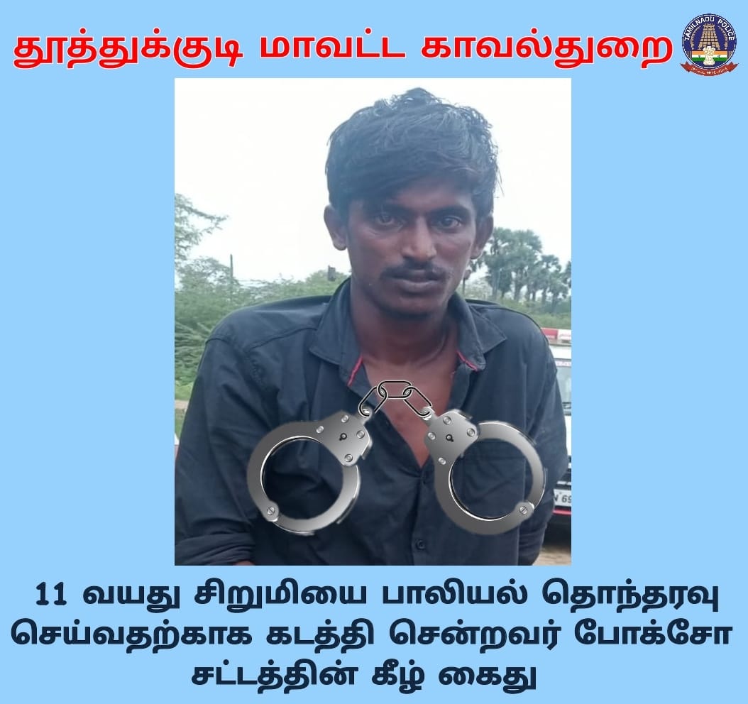 தாப்பாத்தி அகதிகள் முகாம் பகுதியை சேர்ந்த முருகைய்யா மகன் சுஜீவன் (எ) சந்தோஷ் (22) என்பவர் நேற்று (23.11.2021) எட்டையாபுரம் காவல் நிலைய எல்லைக்குட்பட்ட பகுதியில் 11 வயது சிறுமியை பாலியல் தொந்தரவு செய்வதற்காக கடத்தி சென்றபோது கையும் களவுமாக பிடிப்பட்டுள்ளார்.