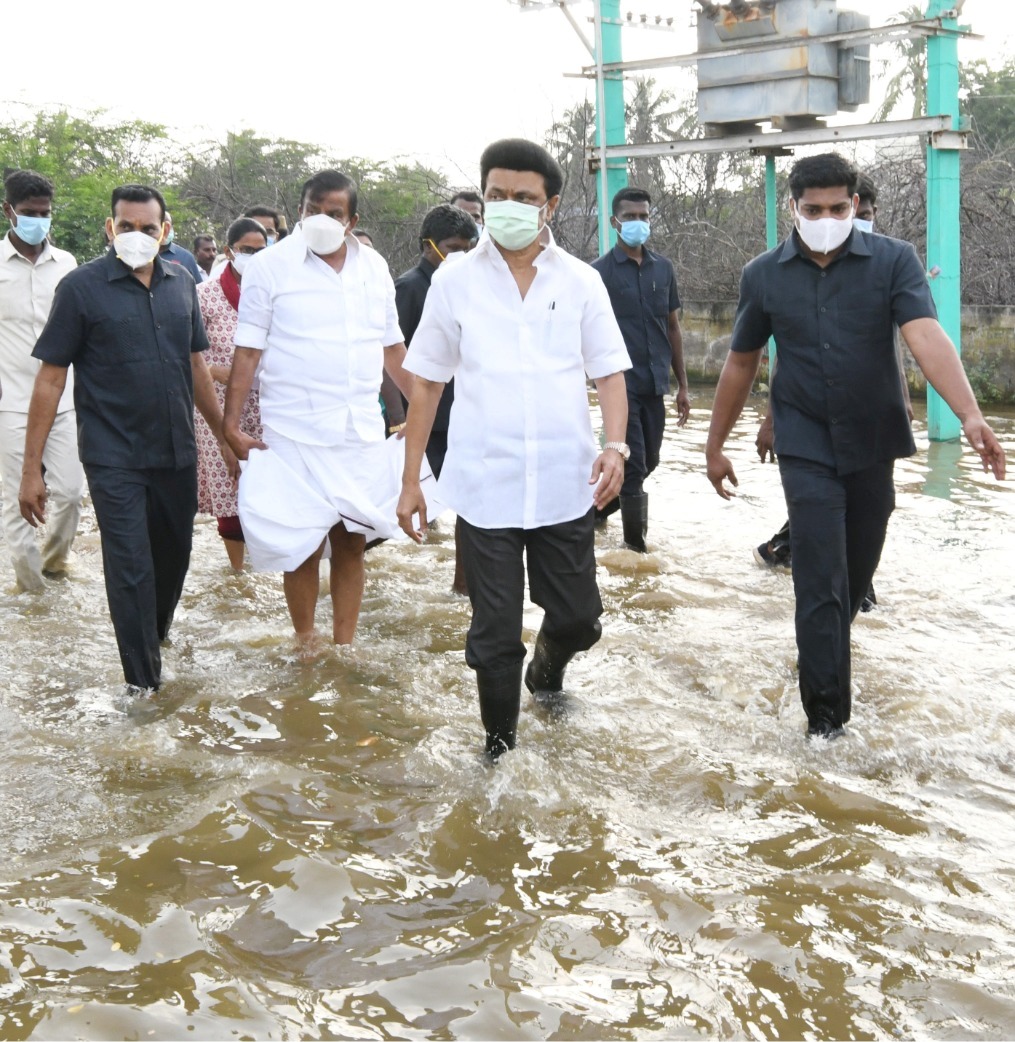 தமிழக முதல்வர் மு.க.ஸ்டாலின் தூத்துக்குடியில் மழை பாதிப்புகளை பார்வையிட சென்னையில் இருந்து விமானம் மூலம் தூத்துக்குடி வந்தார். தொடர்ந்து, விமான நிலையத்தில் இருந்து கார் மூலம் புறப்பட்ட முதல்வர் மு.க. ஸ்டாலின் தூத்துக்குடி மாநகராட்சிக்குள்பட்ட பிரையன்ட்நகர் 1 ஆவது தெரு பகுதியிலும், 6 ஆவது தெரு பகுதியிலும் மழை பாதித்த இடங்களை நேரில் பார்வையிட்டார். தேங்கிய தண்ணீரில் சிறிது தொலைவு நடந்து சென்று பார்வையிட்ட அவர் தண்ணீரை உடனடியாக வெளியேற்ற அதிகாரிகளுக்கு உத்தரவிட்டார்.
