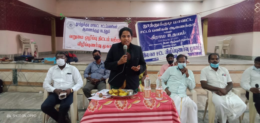 தூத்துக்குடி மாவட்ட சட்டப்பணிகள் ஆணைக்குழவின் செயலாளர் தனது தலைமையுரையில இலவச சட்டத்திட்டத்தை பற்றியும், அரசு நலத்திட்டத்தை இலவச சட்ட உதவி மையம் மூலமாக எவ்வாறு பெறலாம் என்றும், குழந்தைகள் பாதுகாப்பு உறுதி செய்யப்பட வேண்டும் என்றும், சட்டம் சம்பந்தப்பட்ட பிரச்சனைகளுக்கு இலவச சட்ட உதவி மையத்தை தொடர்பு கொள்ளுமாறு பொதுமக்களுக்கு கூறினார். மேற்படி சட்ட விழிப்புணர்வு முகாமை தூத்துக்குடி மாவட்ட சட்டப்பணிகள் ஆணைக்குழுவின் பணியாளர்கள் திரு.A.நம்பிராஜன், திரு.T.பால் செல்வம் மற்றும் கிராம உதய தொண்டு நிறுவன ஊழியர் திரு.செல்வம், திரு.ராமச்சந்திரன் ஆகியோர்கள் செய்திருந்தார்கள்.