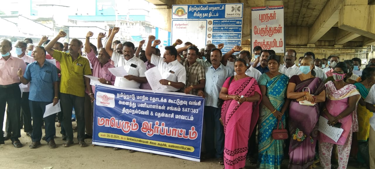 15 அம்ச கோரிக்கைகளை வலியுறுத்தி நெல்லை தென்காசி மாவட்டத்தைச் சேர்ந்த மாநில தொடக்கக் கூட்டுறவு வங்கி அனைத்து பணியாளர் சங்கத்தினர் நிலையில் ஆர்ப்பாட்டத்தில் ஈடுபட்டனர்