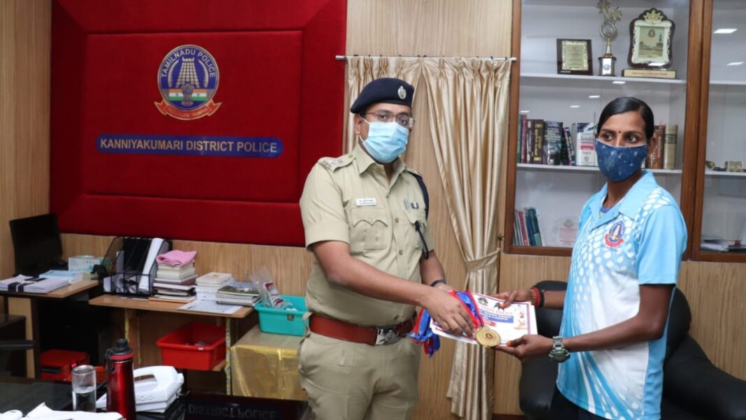 தமிழ்நாடு காவல்துறையினருக்கான மண்டல அளவிலான தடகளப் போட்டியில் வெற்றி பெற்ற பெண் காவலரை பாராட்டிய மாவட்ட காவல் கண்காணிப்பாளர்