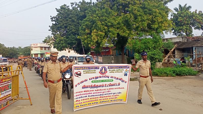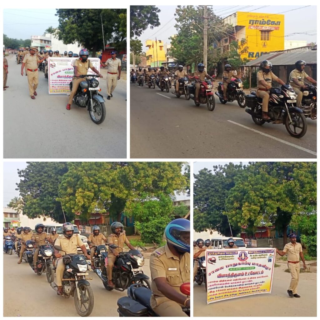 தூத்துக்குடி மாவட்டத்தில் சாலை பாதுகாப்பு மாதத்தை முன்னிட்டு தூத்துக்குடி மாவட்டம் முழுவதும் விழிப்புணர்வு பேரணி பல்வேறு பகுதியில் நடைபெற்று வருகிறது.