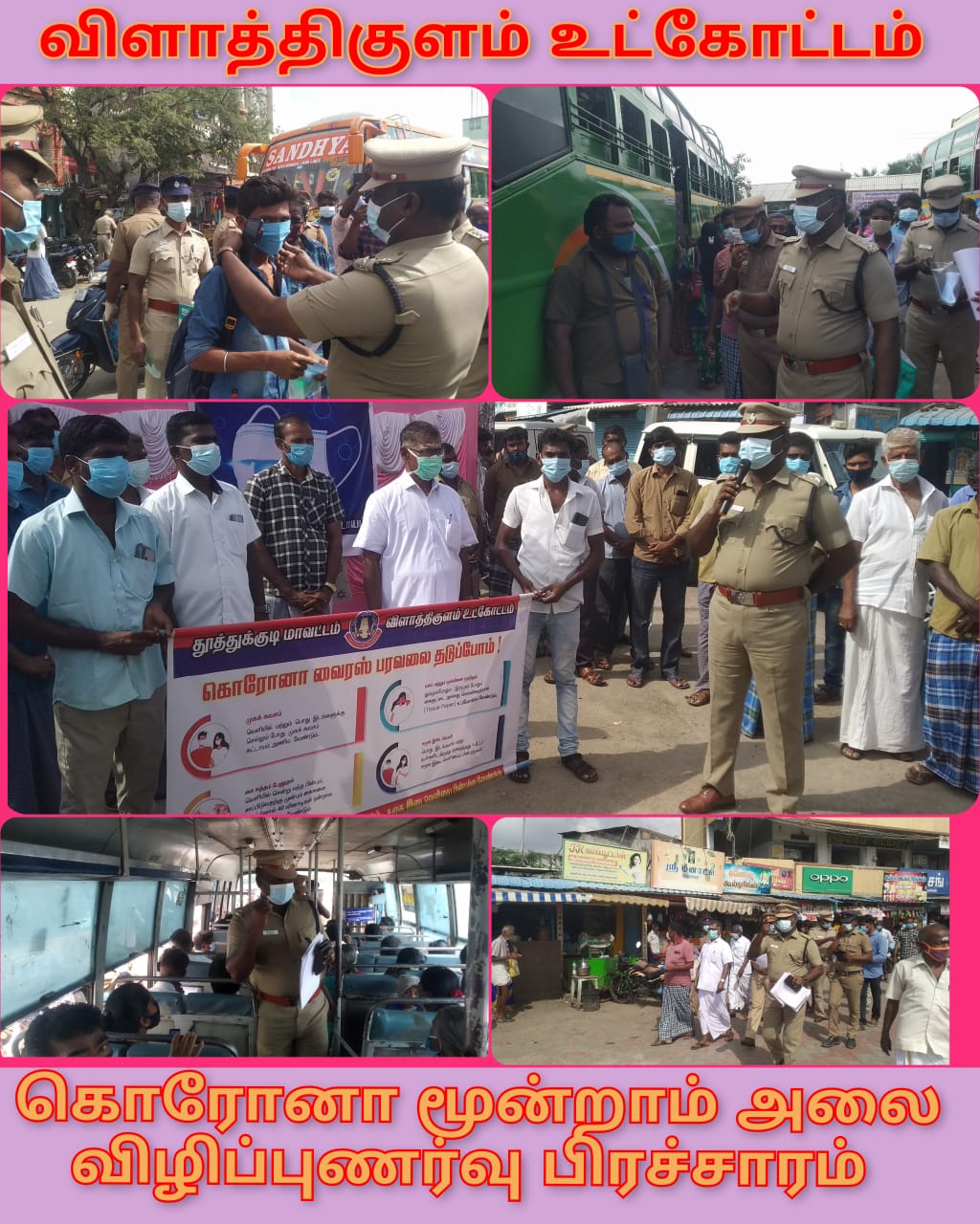 கொரோனா 3-வது அலை பரவுவதை தடுக்கும் விதமாக ஞாயிற்று கிழமைகளில் முழு ஊரடங்கும் மற்ற நாட்களில் இரவு 10.00 மணி முதல் காலை 05.00 மணி வரை முழு ஊரடங்கை தமிழக அரசு உத்தரவு பிறப்பிக்கப்பட்டதை தொடர்ந்து விளாத்திகுளம் துணை காவல் கண்காணிப்பாளர் திரு.பிரகாஷ் அவர்கள் தலைமையில் விளாத்திகுளம் பேருந்து நிலையத்தில் வியாபாரி சங்கத்தினர், ஆட்டோ ஓட்டுநர்கள், பயணிகள், பொதுமக்கள் ஆகியோர்க்கு முகக்கவசம், விழிப்புணர்வு சீட்டுகள் கொடுக்கப்பட்டது மற்றும் சமூகஇடைவெளி கடைபிடிப்பது போன்ற அறிவுரை வழங்கப்பட்டது.