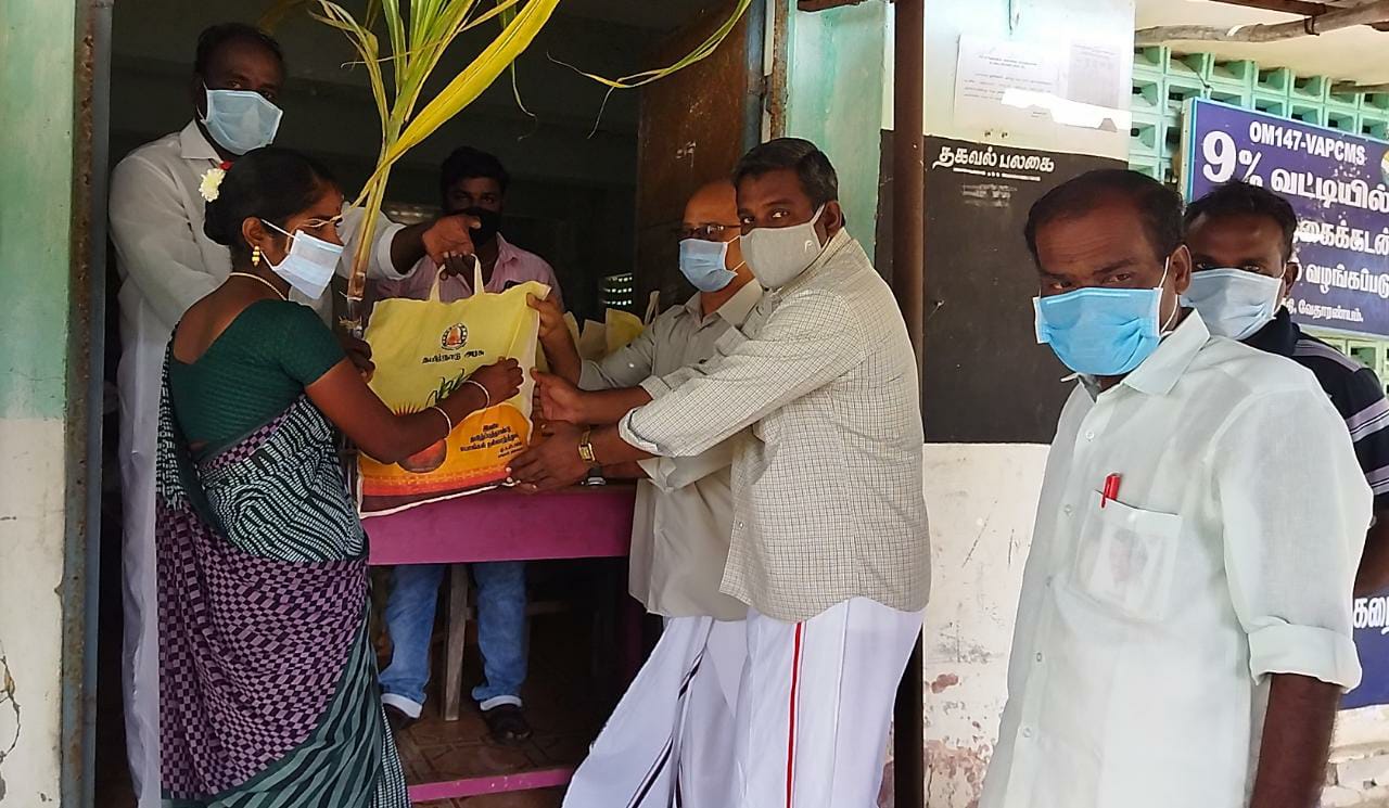 நாகை மாவட்டம் வேதாரண்யம் அடுத்த கோடிக்கரையில் பொங்கல் தொகுப்பு பொருட்கள் அடங்கிய பையை பயனாளிகளுக்கு கோடிக்கரை ஊராட்சி மன்ற தலைவர் சுப்பிரமணியன் வழங்கி தொடங்கி வைத்தார். இந்நிகழ்ச்சியில் ஊராட்சி மன்றத் துணைத் தலைவர் குமார்,கடல் மீனவர் கூட்டுறவு சங்க தலைவர் அருளானந்தம் மற்றும் ஊராட்சி மன்ற உறுப்பினர்கள், பிரமுகர்கள் ஜி.ஞானசேகரன் , என்.பீர்முகமது , எஸ். முருகேசன் உள்ளிட்டோர் பங்கேற்றனர்.