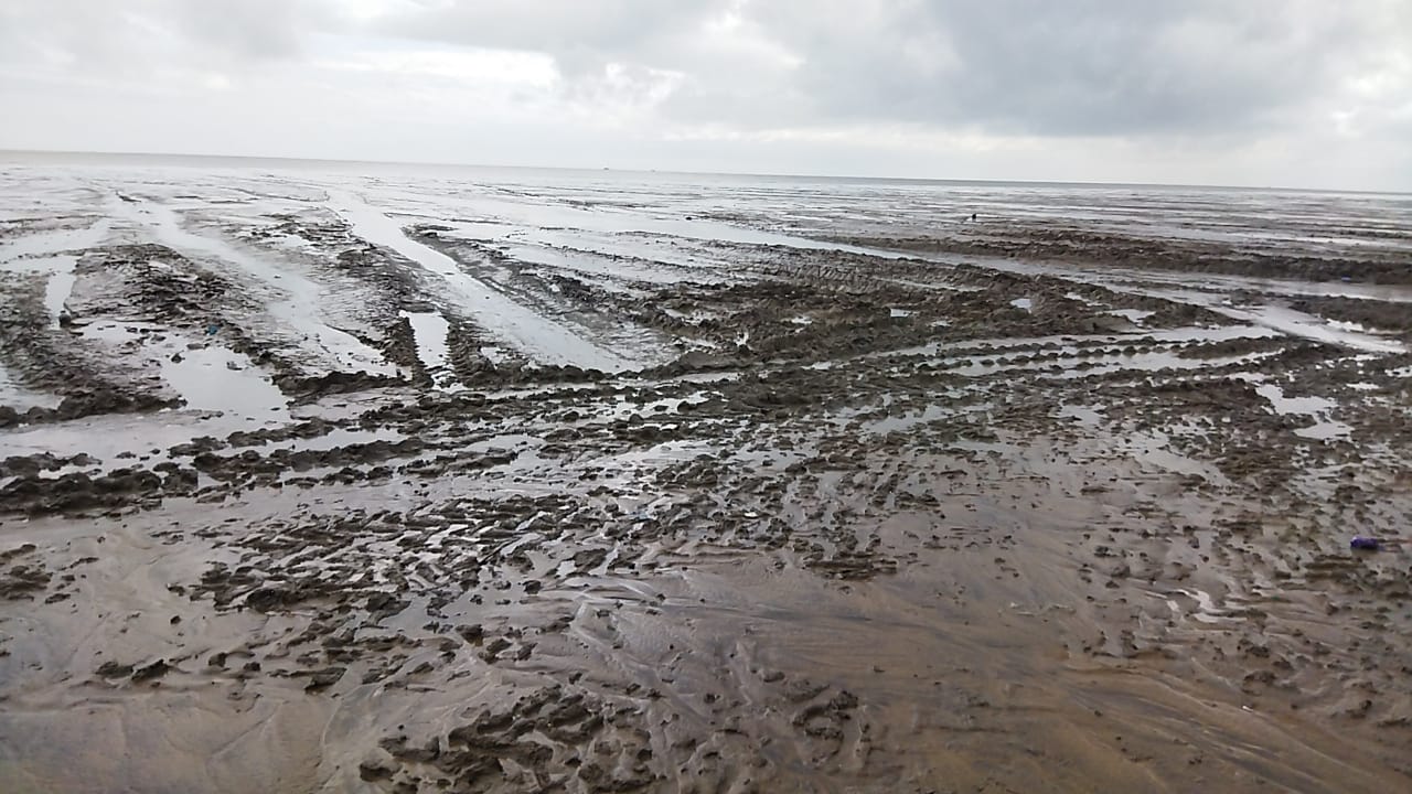 புஷ்பவனம் கடற்கரையோரத்தில் அதிக அளவில் சேறு கரை ஒதுங்கி உள்ளதை பார்வையிட்ட ஆட்சியர்.