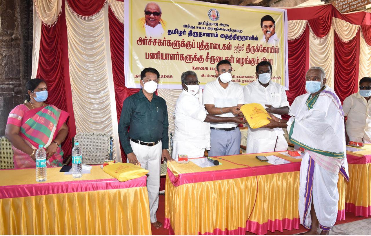 நாகப்பட்டினம் மாவட்டம் இந்து சமய அறநிலையத்துறை சார்பில் அர்ச்சகர்களுக்கு புத்தாடைகள் மற்றும் திருக்கோயில் பணியாளர்களுக்கு சீருடைகள் வழங்கும் விழா மாவட்ட ஆட்சியர் டாக்டர் அருண்தம்புராஜ் நேற்று தொடங்கி வைத்தார்.