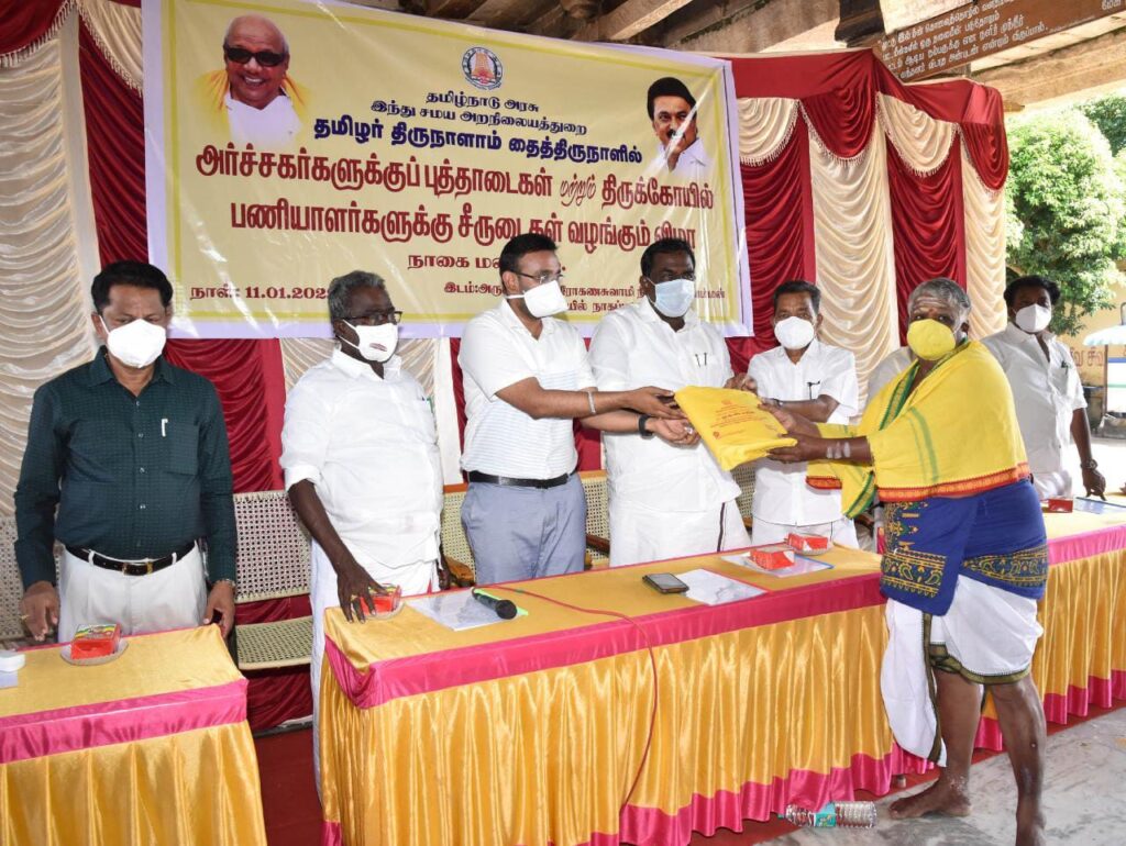 நாகப்பட்டினம் மாவட்டம் இந்து சமய அறநிலையத்துறை சார்பில் அருள்மிகு காயரோகணசுவாமி நீலாயதாட்சி அம்மன் திருக்கோயிலில் அர்ச்சகர்களுக்கு புத்தாடைகள் மற்றும் திருக்கோயில் பணியாளர்களுக்கு சீருடைகளை மாவட்ட ஆட்சியர் டாக்டர் அருண்தம்புராஜ் வழங்கினார்.