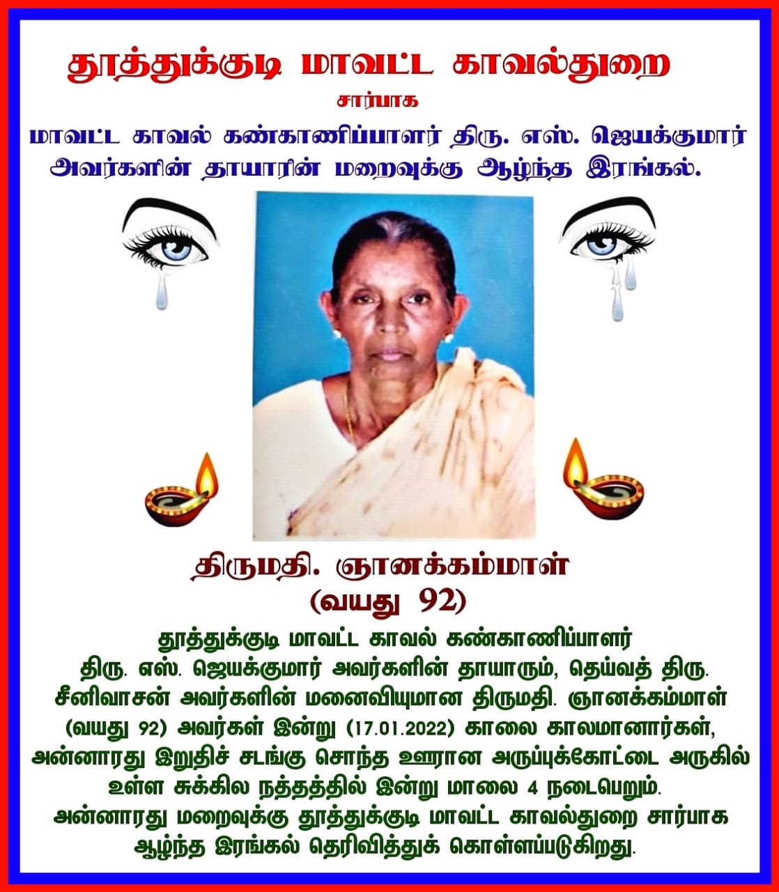 தூத்துக்குடி மாவட்ட காவல் கண்காணிப்பாளர் திரு. எஸ். ஜெயக்குமார் அவர்களின் தாயாரும், தெய்வத் திரு. சீனிவாசன் அவர்களின் மனைவியுமான திருமதி ஞானக்கம்மாள் (வயது 92) அவர்கள் இன்று (17.01.2022) காலை உசிலம்பட்டியில் காலமானார்கள்.*