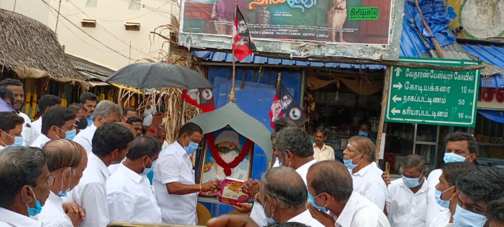முன்னாள் முதல்வர் எம்ஜிஆர் 105 ஆவது பிறந்தநாள் விழா- வேதாரண்யத்தில் முன்னாள் அமைச்சர் ஓ. எஸ். மணியன் முன்னாள் முதல்வர் எம்.ஜி.ஆர் திருவுருவப் படத்திற்கு மாலையிட்டு மரியாதை.