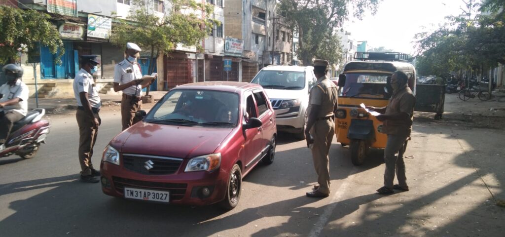 மதுரை தெற்கு வாசல் சந்திப்பில் வரும் வாகனங்களை தெற்கு வாசல் சட்டம் ஒழுங்கு காவல் உதவி ஆய்வாளர் சோமு , போக்குவரத்து காவல் உதவி ஆய்வாளர் நவநீதன் மற்றும் காவலர் சண்முக வேல் ஆகியோர் தீவிர வாகன சோதனையில் ஈடுபட்டு வருகின்றனர்.