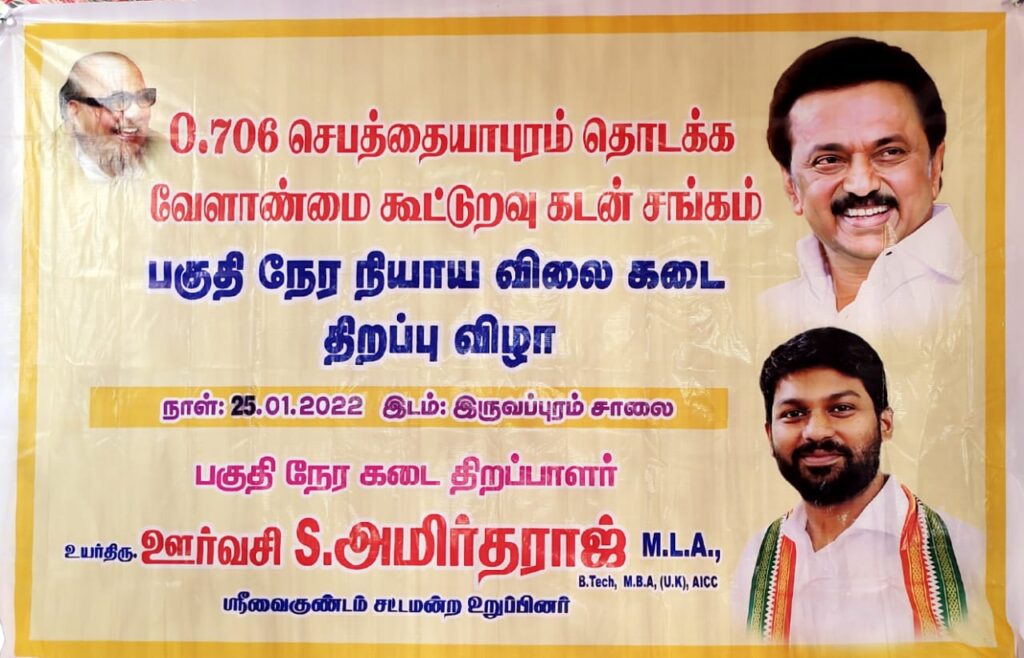 0.706 செபத்தையாபுரம் தொடக்க வேளாண்மை கூட்டுறவு கடன் சங்கம் சார்பில் இருவப்புரம் சாலை அருகே பகுதிநேர நியாய விலை கடை திறக்கப்பட்டது. இதனை ஸ்ரீவைகுண்டம் சட்டமன்ற உறுப்பினரும் தெற்கு மாவட்ட காங்கிரஸ் கமிட்டி தலைவருமான ஊர்வசி எஸ். அமிர்தராஜ் அவர்கள் திறந்து வைத்தார்கள். இந்த நிகழ்ச்சியில் செபத்தையாபுரம் ஊர் பொதுமக்கள், காங்கிரஸ் தொண்டர்கள், நிர்வாகிகள், கூட்டுறவு துறை அதிகாரிகள், ஊழியர்கள் பலர் கலந்து கொண்டனர்.