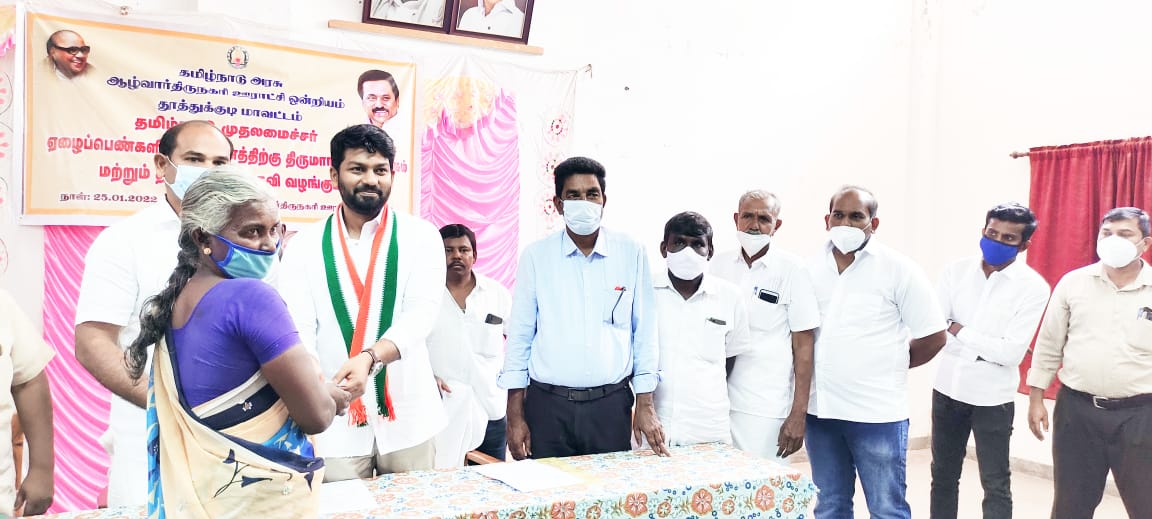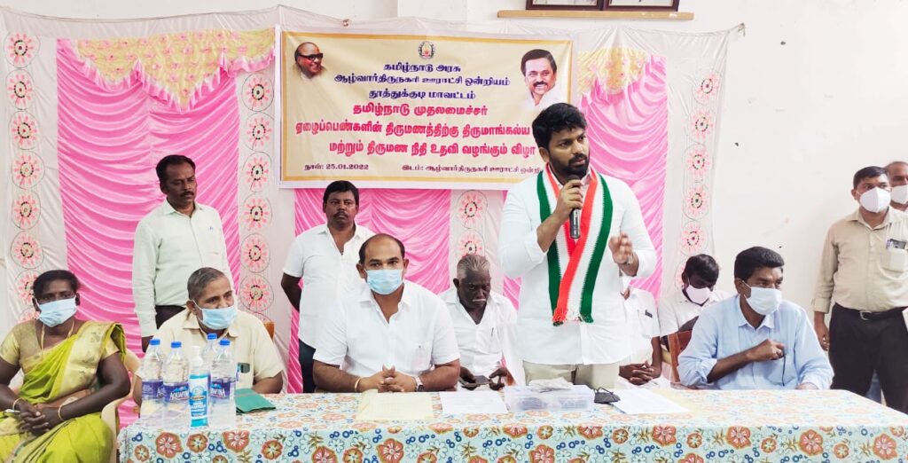 இதில் சிறப்பு அழைப்பாளராக ஸ்ரீ வைகுண்டம் சட்டமன்ற உறுப்பினர் கலந்து கொண்டு பயனாளிகளுக்கு தாலிக்கு தங்கம் வழங்கி பேசினார்.