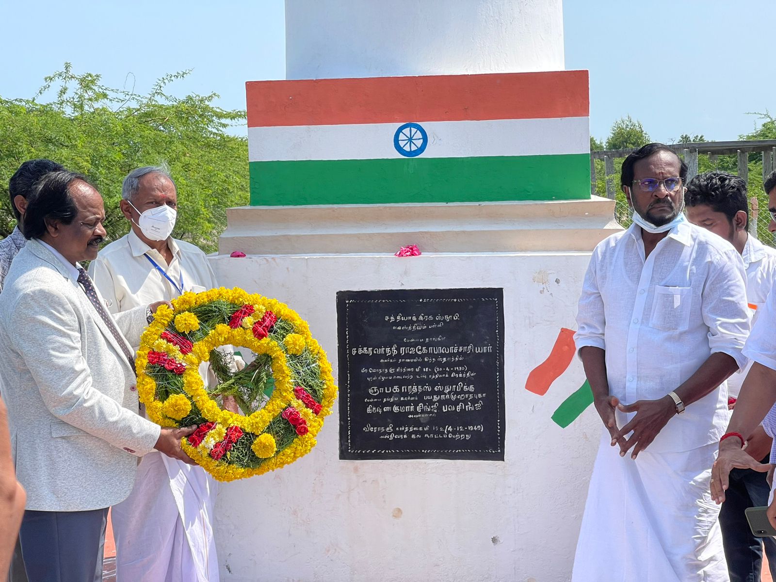 பின்னர் உப்புத்துறை அலுவலகம் மற்றும் உப்பு சத்தியகிரக நினைவு ஸ்தூபிக்கு சென்ற தமிழ்நாடு மத்திய பல்கலைக்கழக துணை வேந்தர் டாக்டர் கிருஷ்ணன் ராஜாஜி சிறை வைக்கப்பட்ட இடம் மற்றும் நினைவு ஸ்தூபியில் மலரஞ்சலி செலுத்தினார். நிறைவாக இளையோர் எக்ஸ்னோரா இண்டர்நேஷனல் சேக்தாவூது நன்றி கூறினார்.