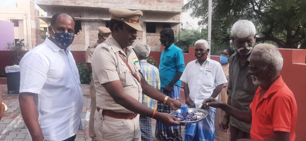 காவலர்கள் மற்றும் பொதுமக்களுக்கு இனிப்புகளை வழங்கினார்.
