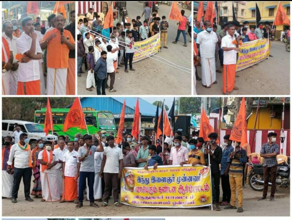 விருதுநகரில் இந்து இளைஞர் முன்னணி சார்பில் கண்டன ஆர்ப்பாட்டம் நடைபெற்றது. இந்த ஆர்ப்பாட்டத்தில் இந்து முன்னணி